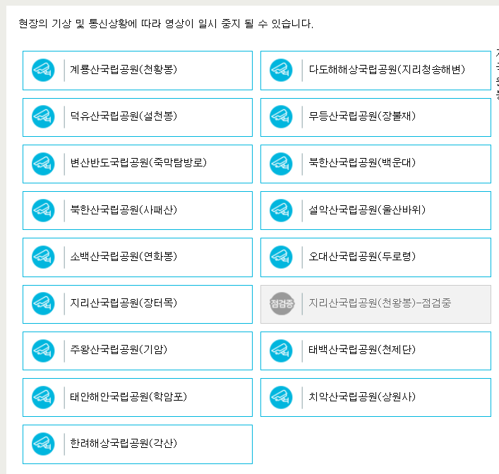 또한 인터넷 연결이 필요한 모바일 국립공원 CCTV의 경우 신호 상태가 불안정할 경우 일부 지역에 따라 국립공원의 모습이 보기 어려울 수 있습니다.