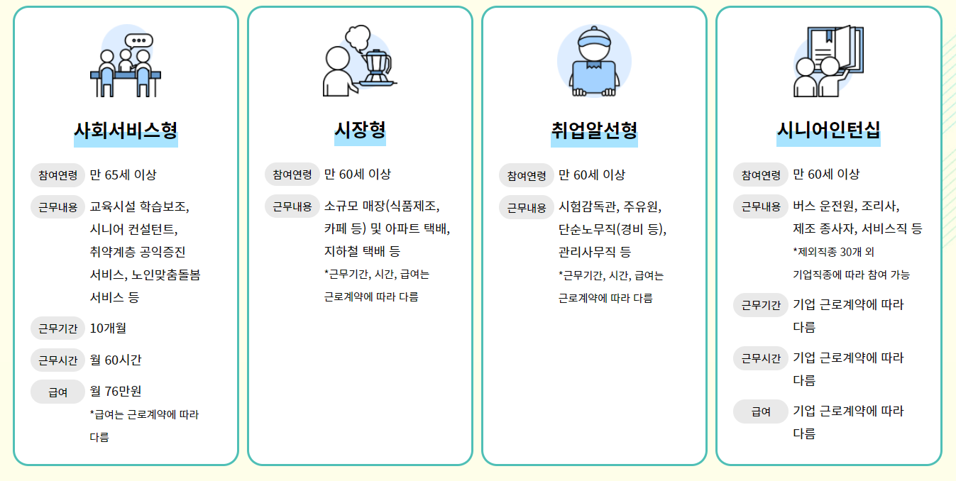 예를 들어, 공익형 일자리는 주로 만 65세 이상을 대상으로 하고, 사회서비스형 일자리 등은 만 60세 이상도 참여할 수 있습니다.