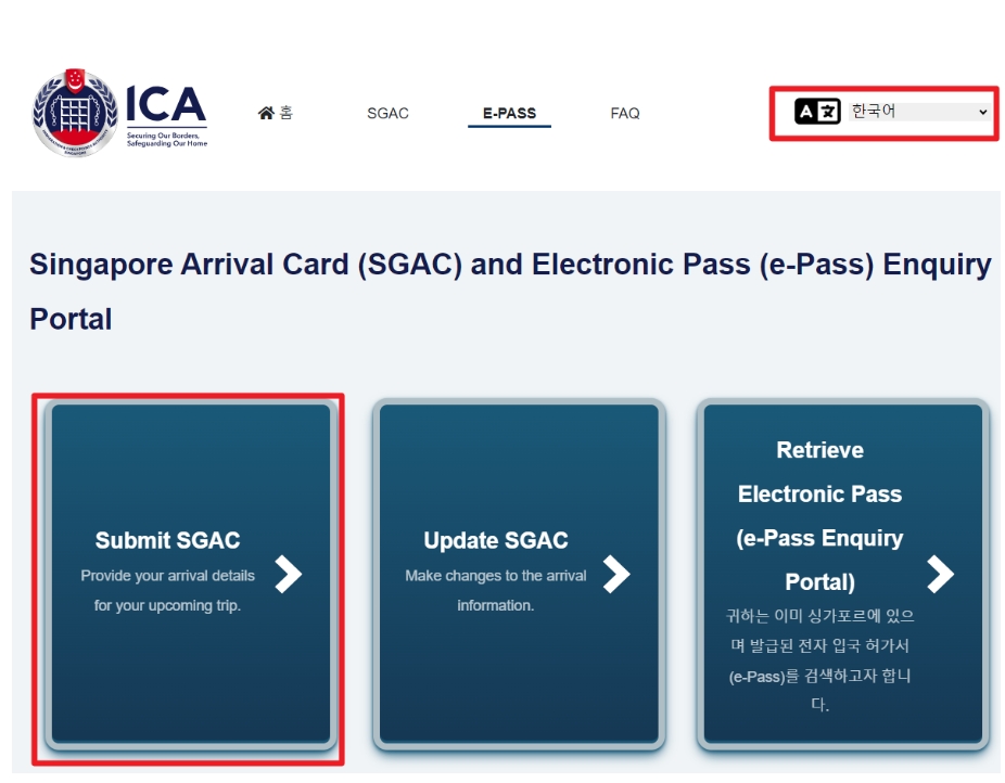 가장 먼저 해야할 것은 바로 언어를 한국어로 변경해주는 것 입니다. 싱가포르 입국신고서는 한국어 변환 후 이용할 수 있어 매우 간편합니다. 오른쪽 상단에 위치한 박스에서 '한국어'를 클릭해주시면 바로 사이트 자체가 한국어 버전으로 변경됩니다.